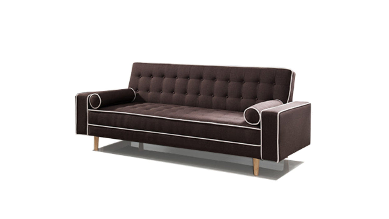 Enhance your living space with the Castiel Futon Sofa, a mid-century modern masterpiece combining style and functionality. This versatile piece features sleek tapered solid wood legs, premium fabric upholstery with elegant white contrast piping, and tufted seat and back cushions with matching bolster pillows. Designed for both comfort and durability, it boasts a sturdy hardwood frame with thick foam padding. The backrest easily drops to transform into a full-sized bed, perfect for hosting guests.