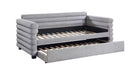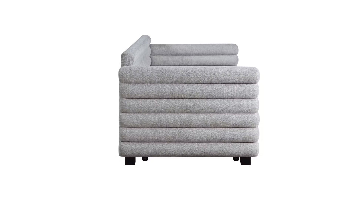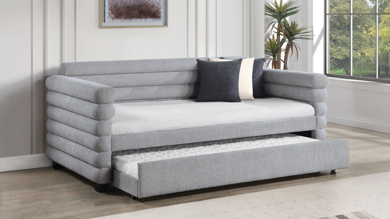 You’ll love the Patricia daybed with its eye-catching silhouette and boucle upholstery, bringing a fresh, modern touch to any living room or den. The contemporary design features layered round bolsters, adding unique texture and depth. Upholstered in boucle fabric, it exudes warmth and character. With twin-sized daybed and trundle options, it’s ideal for daily lounging or accommodating two overnight guests. This stylish piece combines impressive aesthetics with versatile functionality, making it a perfect addition to any space.
